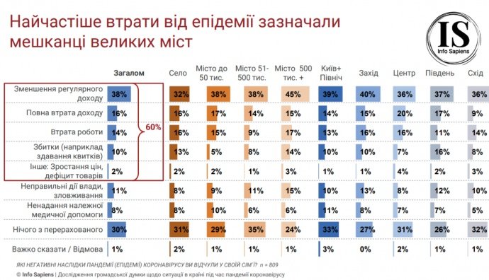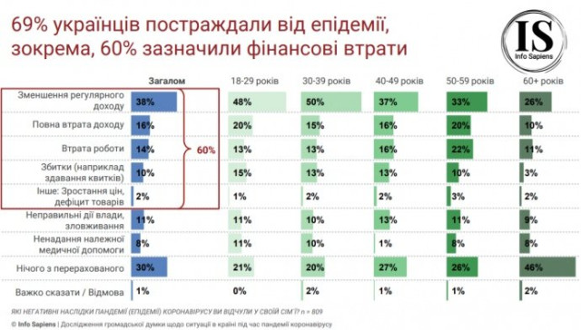 38% дорослих українців заявили про зменшення регулярного доходу родини унаслідок епідемії коронавірусу, 16% – про повну втрату доходу, 14% – про втрату роботи, загалом 60% українців назвали щонайменше 1 вид фінансових втрат.