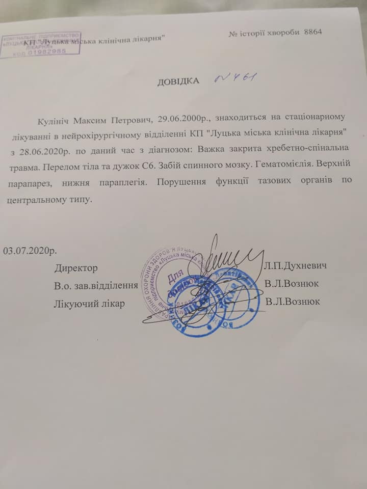 Максим отримав травму 28 червня, лікарі діагностували перелом тіла та дужок С6 (6-й шийний).