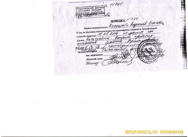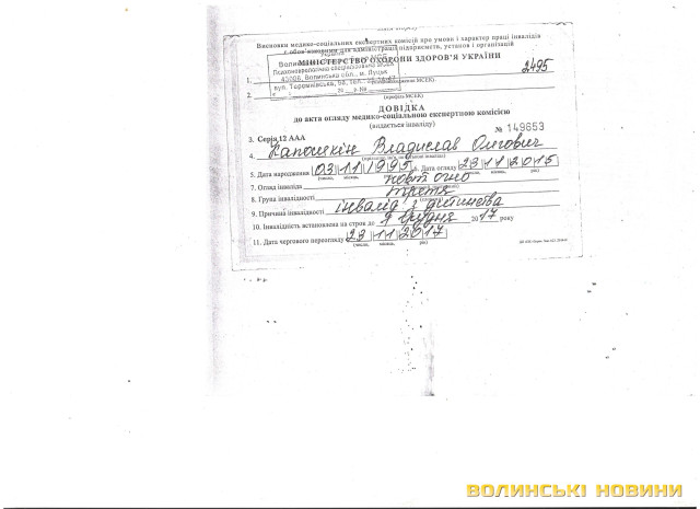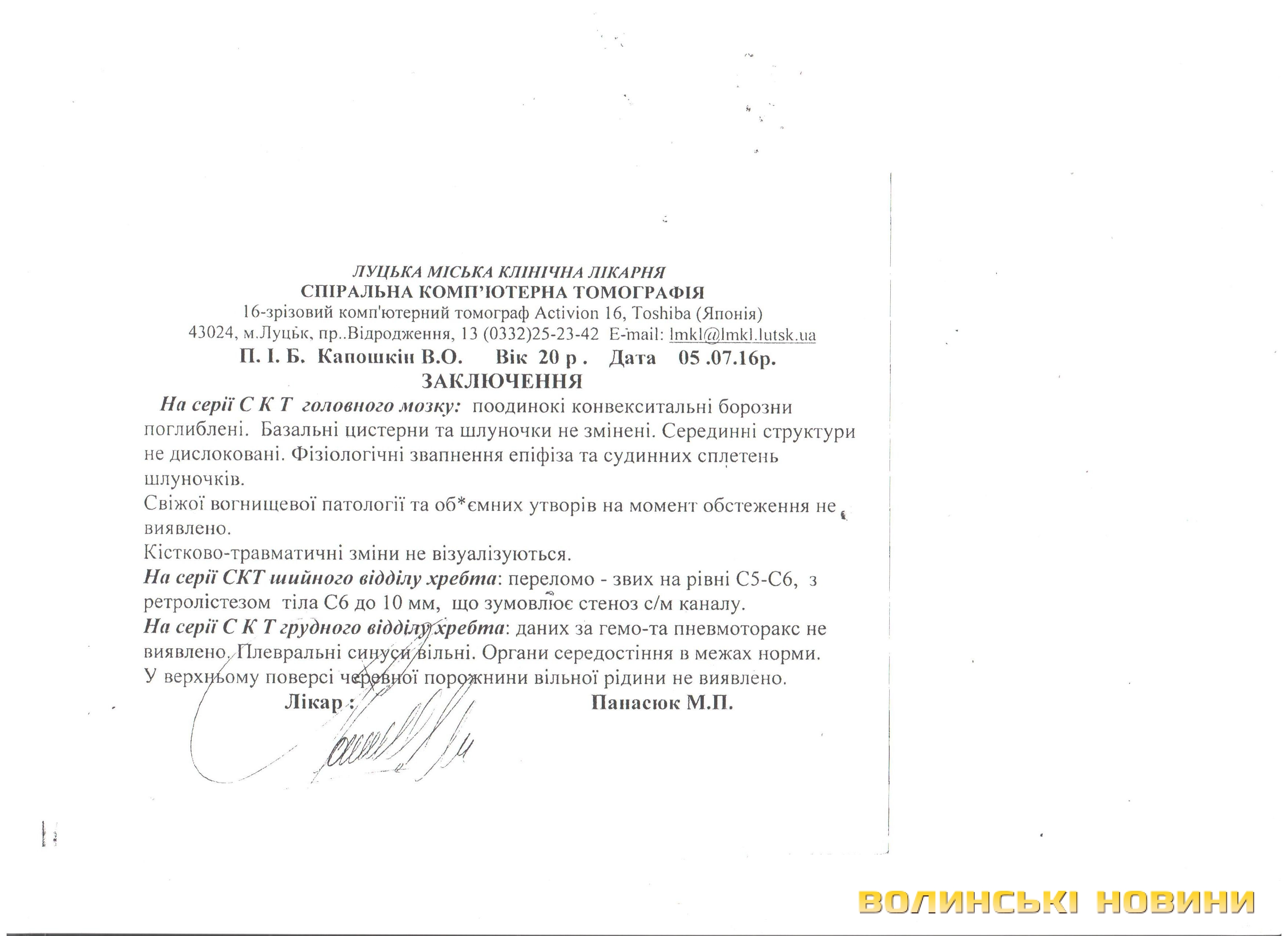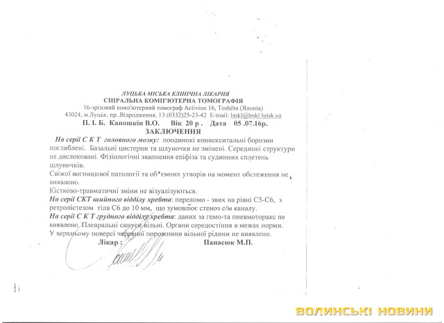 Лучанин Владислав Капошкін - інвалід дитинства, 15 років хворіє епілепсією. У результаті падіння отримав перелом 5-6 шийних хребців. Наразі 20-річний юнак перебуває в реанімації. Мама хлопця - інвалід I групи. Батько звертається до усіх небайдужих з проханням допомогти врятувати сина.