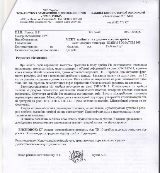 У Любомльській районній лікарні постраждалий провів близько трьох тижнів. У Ковелі лікарі зробили МРТ. Результати обстеження - невтішні, потрібно негайно робити операцію. Нині він удома лежить прикутий до ліжка, адже зовсім не відчуває нижніх кінцівок і тазу.