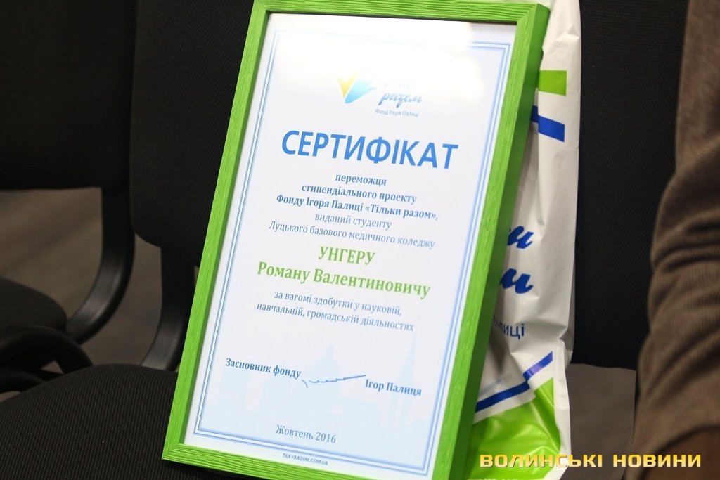 У нашому динамічному житті, найбільше цінуються оригінальні ідеї, креатив. Тому постарайтесь у своїх навчальних закладах взяти для себе максимальний багаж знань, щоб підготуватися до дорослого трудового життя. Але пам’ятайте: найвища цінність – це ваші ідеї і думки, які реалізуються і приносять користь волинянам», - звернувся Орест Маховський до студентів.Серед цьогорічних стипендіатів є й ті, хто не вперше привернув до себе увагу Фонду - тут є студенти, які отримували стипендію Фонду в минулі роки. Крім того, зауважив він, стипендіальний проект розвивається і вже передбачає нагороди для дітей та юнаків, які мають здобутки в спортивній сфері. Зокрема, для 22 ДЮСШ Волині теж передбачили можливість отримання стипендій кращими вихованцями. До слова, вже другий рік поспіль кращі вихованці ДЮФШ «Волинь» також отримують підтримку і мотивацію.Своєю чергою, перший заступник голови правління Фонду «Тільки разом» Лариса Тарасюк розповіла, що відбирати найкращі проекти було дуже складно, адже всі намагалися подавати свої найкращі напрацювання. Вона додала, що Фонд готовий підтримувати стипендіатів і в реалізації проектів, адже чимало з них дотичні програмам, у рамках яких працює Фонд.«Ваші ідеї повинні піти в практичну площину. Торік одна з стипендіаток свою ідею втілила - в 2015 та 2016 роках вона розмалювала палати в дитячих медичних закладах, щоб діткам було легше переносити хворобу в лікарняних стінах. Нам хочеться, щоб ваші пропозиції не залишись лише на папері. У нас є задум і можливості: кадрові, фінансові, на базі одного з Офісу розвитку кварталу започаткувати Клуб стипендіатів фонду, де б ви могли отримати підтримку, щоб реалізувалися ваші проекти, де б разом вдалося продумати, як працювати над втіленням ваших ідей в життя», - повідомила вона.Лариса Тарасюк сподівається, що ця стипендія допоможе студентам відчути, що є небайдужі люди в особі Ігоря Палиці та колективу Фонду.