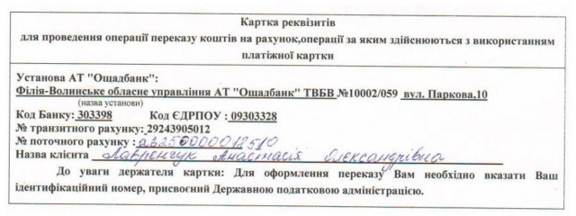 Рахунок Ощадбанк: мама – Лавренчук А.О.: ЄРДПОУ 09303328, МФО 303398,