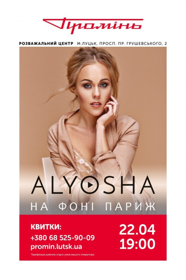 Володарка престижних премій YUNA, «Золотий грамофон» Україна, «Пісня року», Viva, відома українська співачка ALYOSHA дасть концерт у Луцьку. Виступ відбудеться 22 квітня у РЦ «Промінь».