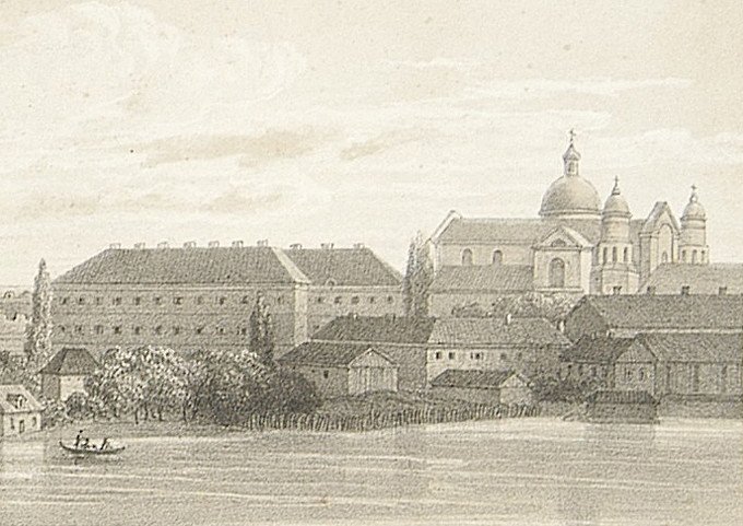Єзуїтські споруди в Луцьку на малюнку Міхала Кулеші 1852 року. Зображення з Національної бібліотеки Польщі