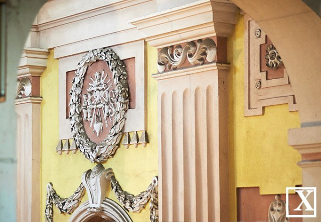 Ліпнина з буквами IHS – емблемою ордену. Розміщена у правій наві колишнього єзуїтського храму в Луцьку