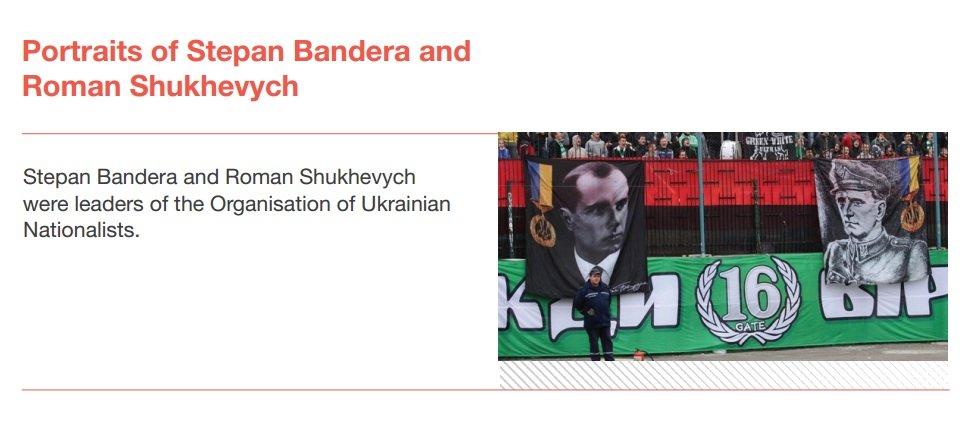 Цікаво, у виданні є цілий розділ зі символікою українських націоналістів. Згідно поглядів FARE їм теж не місце на стадіонах. Так, організація забороняє червоно-чорний прапор, герб дивізії СС «Галичина», портрети Степана Бандери та Романа Шухевича і символ «Ідея нації».