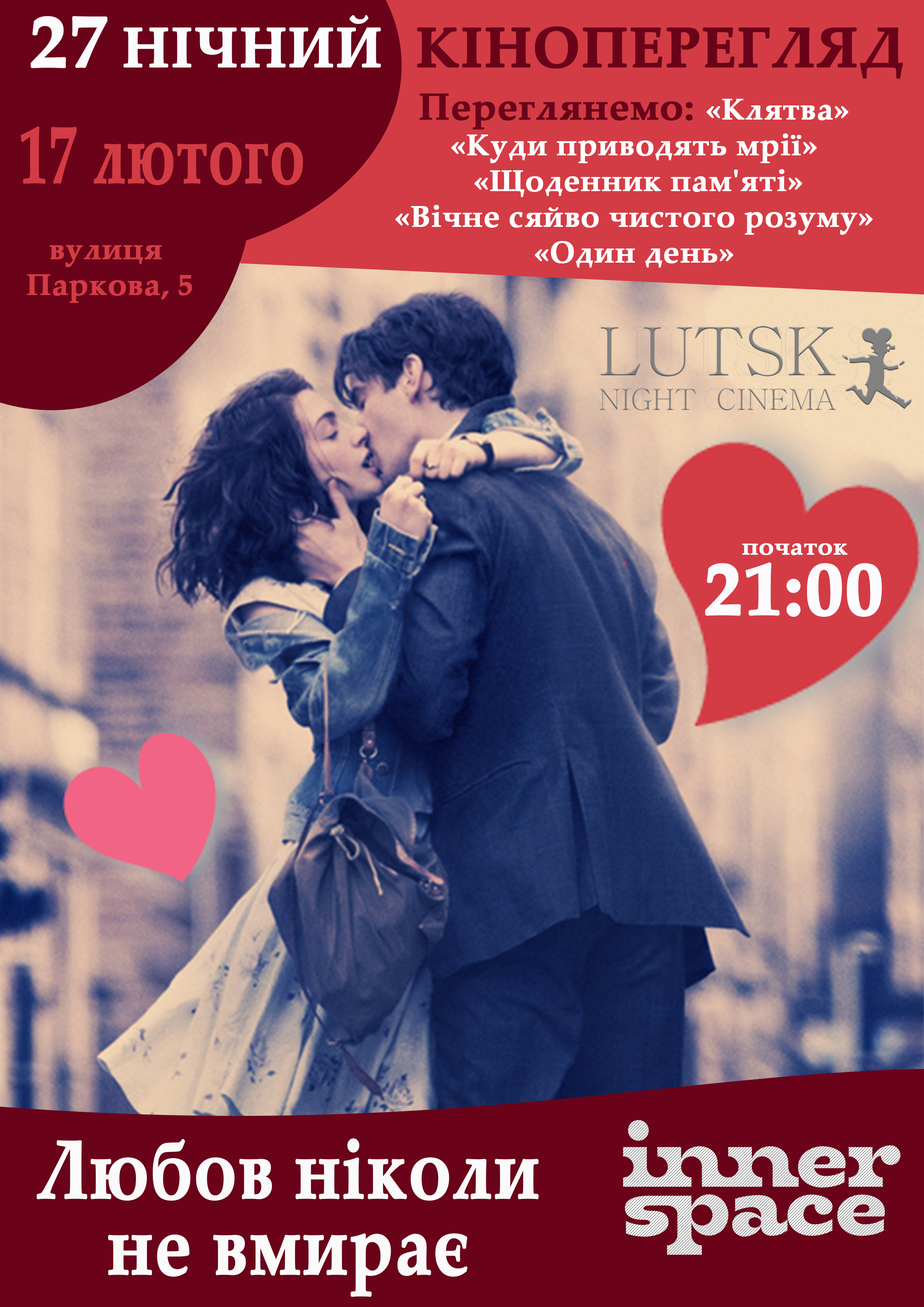 Команда «Lutsk Night Cinema» запрошує на другий цьогорічний кінопоказ. Уже цієї п’ятниці, 17 лютого, о 21:00 у приміщенні антикафе «Inner Space». Кіномани дивитимуться такі відомі та глибокі фільми, як: «Куди приводять мрії», «Щоденник пам'яті», «Вічне сяйво чистого розуму», «Один день» та «Клятва».