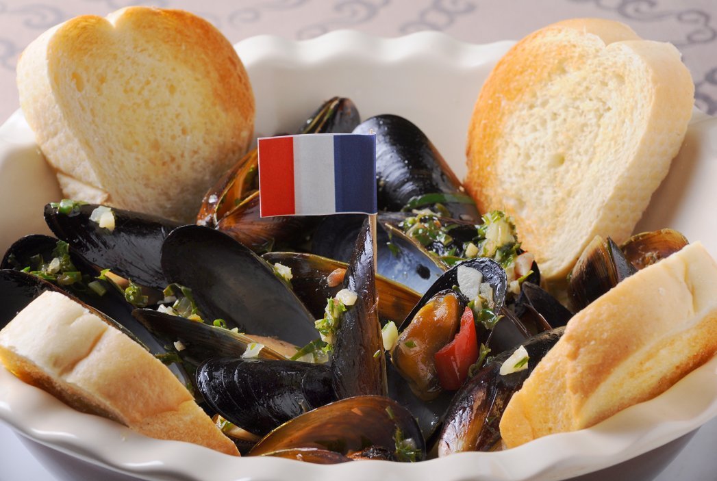 Ах Франція, Франція!!! Усе геніальне – просте. Переконаймося самі у цій істині. Отож, мідії підсмажуються з прованськими травами і часником на добрій оливі, аж поки не розкриються мушлі. Далі додається біле вино, і – готово! Озброюємось хрумким крутоном з багету, і не можемо зупинитись.