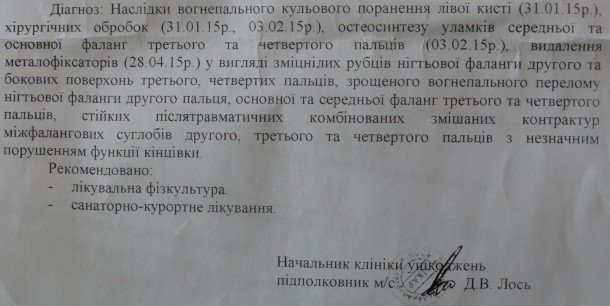 Тож вже з отриманою довідкою Валерій пішов до медиків за випискою з медичної картки і направленням на медико-соціально-експертну комісію. Ще з місяць хлопця тримали в клініці ушкоджень ВМКЦ Західного регіону і нарешті 31 липня видали новий епікриз. В документі, окрім лаконічного викладу історії хвороби зі всіма аналізами, обстеженнями та рекомендаціями, підтверджується, що Валерій Голентюк отримав вогнепальне поранення під час бою в селі Чорнухіно. Та дивує у цьому всьому те, що в останньому епікрізі чомусь вказали, що хлопець звернувся до медиків зі скаргами на біль та обмеження рухів «лівого колінного суглоба»! Щоправда в анамнезі знову ж таки мова про кульове поранненя лівої кисті, переломи, видалення та остеосинтез уламків пальців.