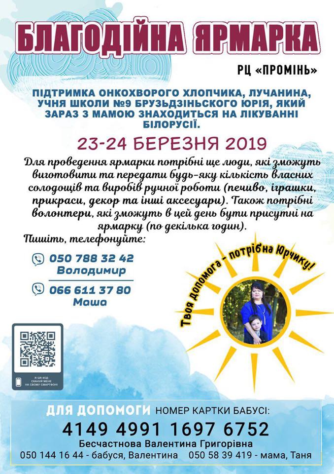 Лікування дороговартісне, тому Юрію необхідні кошти. Задля підтримки онкохворого хлопчика у луцькому РЦ «Промінь» 23-24 березня відбудеться благодійна ярмарка.