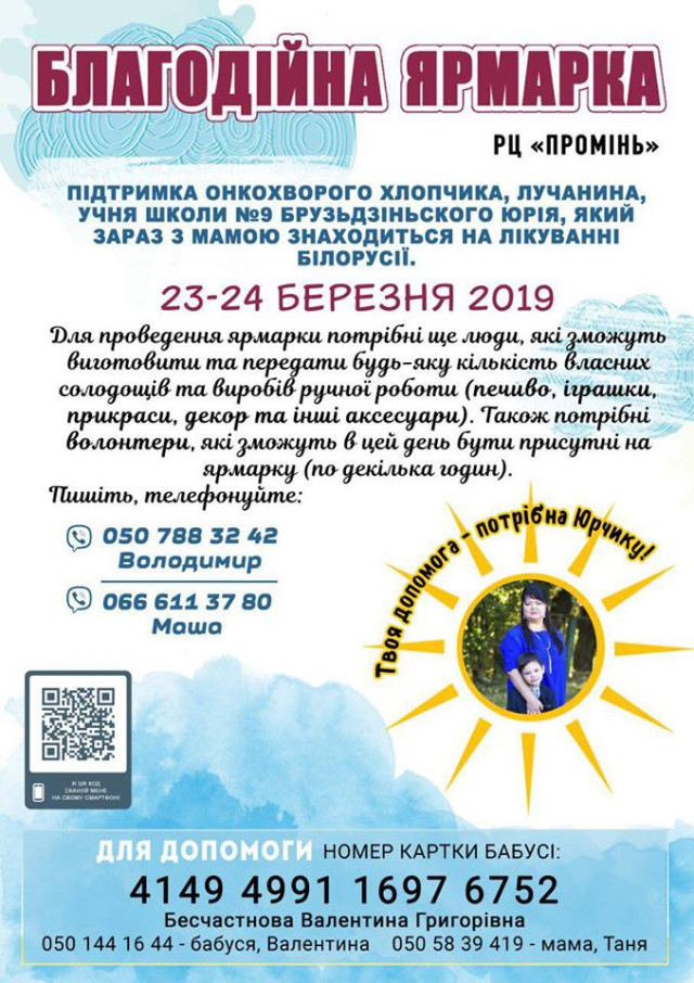 Лучан, які можуть приготувати будь-яку кількість солодощів (зокрема, печива) або виготовити декор, прикраси, іграшки, тощо запрошують долучитися до ярмарки. Всіх небайдужих краян, які мають чуйне серце і готові допомогти Юрію, закликають прийти на благодійну ярмарку.