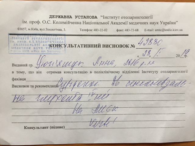 Як розповіла бабуся дівчинки Галина Петрівна, Аня народилася здоровою, добре чула, навіть почала говорити перші слова: мама, тато, баба. Але, коли взимку захворіла, місцеві лікарі зауважили, що маля недочуває, тому відправили на обстеження до обласної лікарні, а звідти й до Києва. Лікарі діагностували глухоту, яка стала ускладненням після перенесеної хвороби.