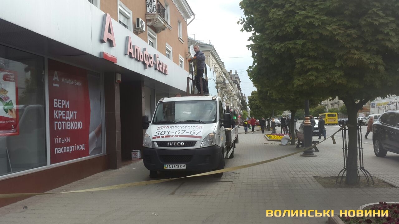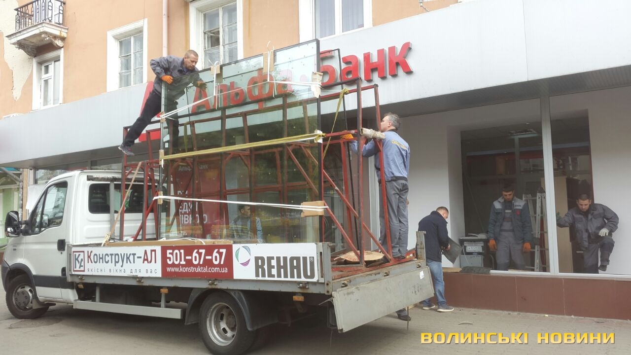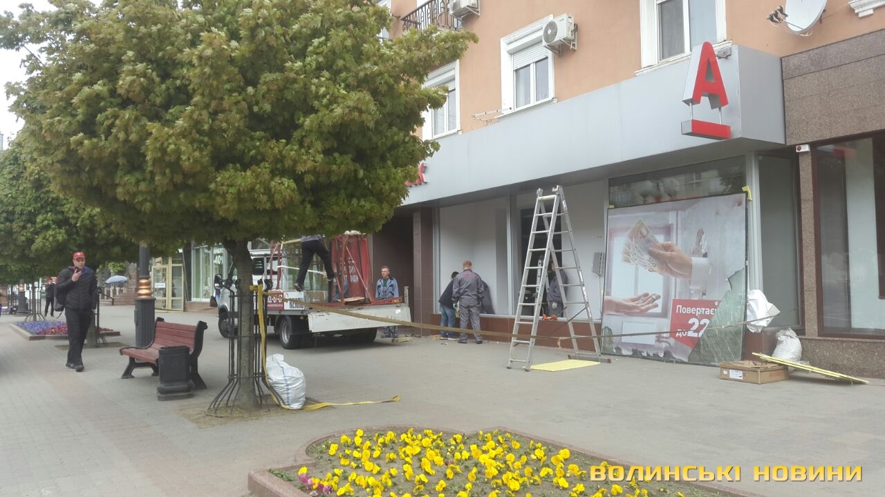 Альфа-Банк у Луцьку замінює побиті вітрини. Фотофакт
