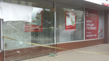 У відділенні Альфа-Банку сьогодні міняють побиті вітрини. Перехожі думають, що вікна знов побили.
