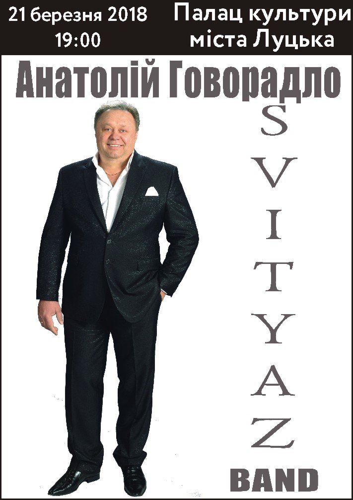 Соліст легендарного українського гурту «Світязь» - музикант, композитор, співак Анатолій Говорадло 21 березня у супроводі ансамблю «Світязь Бенд» виступить з концертом у Луцьку. Захід відбудеться у Палац культури міста Луцька о 19:00.