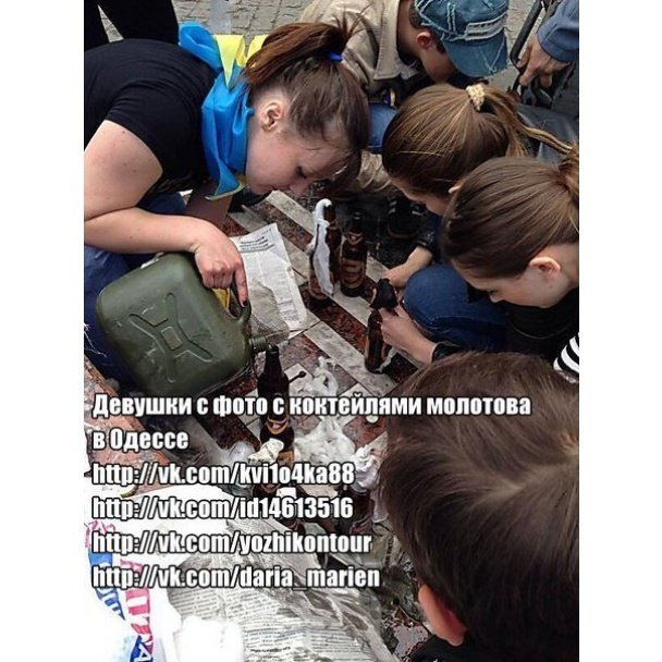 А ви думаєте ті дівки на фото не знали що роблять і чим може все закінчитися для людей коли коктейлі Молотова робили?Взяти одну таку бутилку і їй в пику зацідити,хай би живим факелом попрацювала.А потім це зняти на відео і викласти в інтернет,щоб інші подумали чим можуть закінчити.Руками ціх відьмочок вбили людей.Повірте,Бог все бачить і якщо не люди то він сам їх точно покарає.