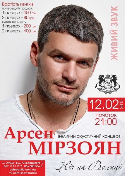 Співак Арсен Мірзоян везе лучанам велику акустичну програму «Ніч на Волині». Концерт відбудеться 12 лютого у «Show Basilic».