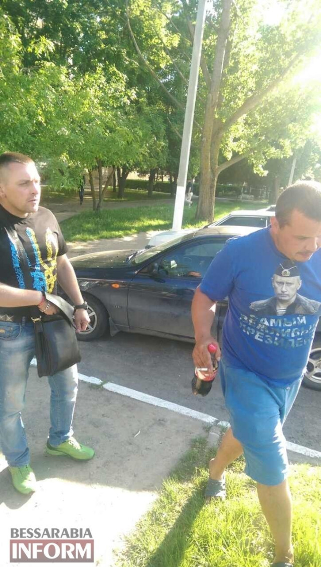 В Ізмаїлі Одеської області учасник АТО змусив прихильників "руского міра" зняти з себе футболку з главою Кремля Володимиром Путіним, після чого порвав її і викинув у сміття.