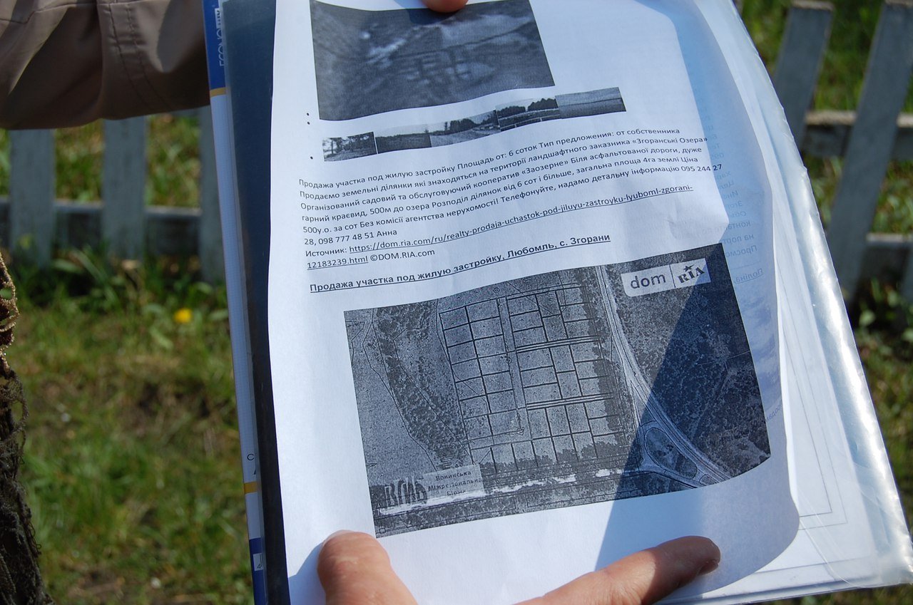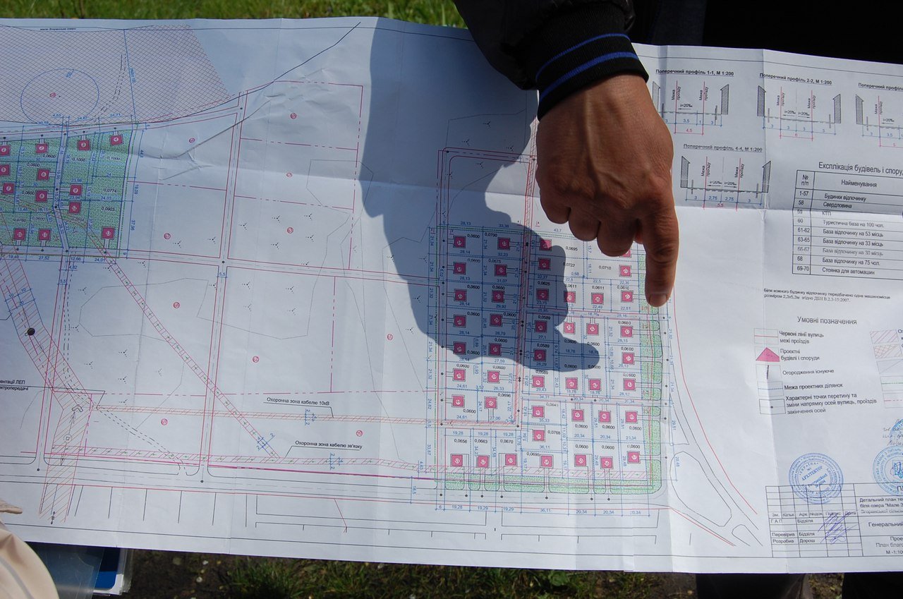 Депутат Любомльської районної ради від політичної партії «Українське об’єднання патріотів – УКРОП» Світлана Прокопук тримає в руках проект детального плану території туристичного комплексу та баз відпочинку біля озера Мале Згоранське кооперативу «Заозерне». Документ нібито розробили у 2017 році на замовлення Любомльської райдержадміністрації. На ньому стоять усі печатки й підписи, проте кінцевих дат немає. Жінка показує: дві ділянки території, одна із яких розташована над трасою, що з’єднує Згорани і Шацьк, та інша, біля самого озера, поділено на квадрати. Там, за задумом проектувальників, будуть розташовуватися 57 будинків для відпочинку, біля кожного з яких передбачено паркомісце для автомобіля. Ліс, який розділяє ці території, поділено на пронумеровані квадрати. Згідно з нумерацією, тут планують звести туристичну базу на 100 осіб, чотири бази відпочинку на 53, 33, 30 і 75 місць та облаштувати величезну стоянку для автомобілів. У плані врахували навіть мощені тротуарні доріжки та свердловину для води. Усі ці споруди розташовані на території згаданого ландшафтного заказника.Величезну територію поділили на шматки та продаватимуть з молотка.