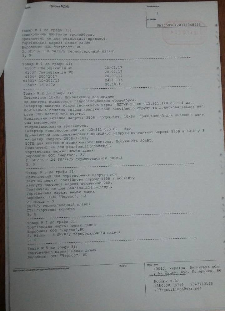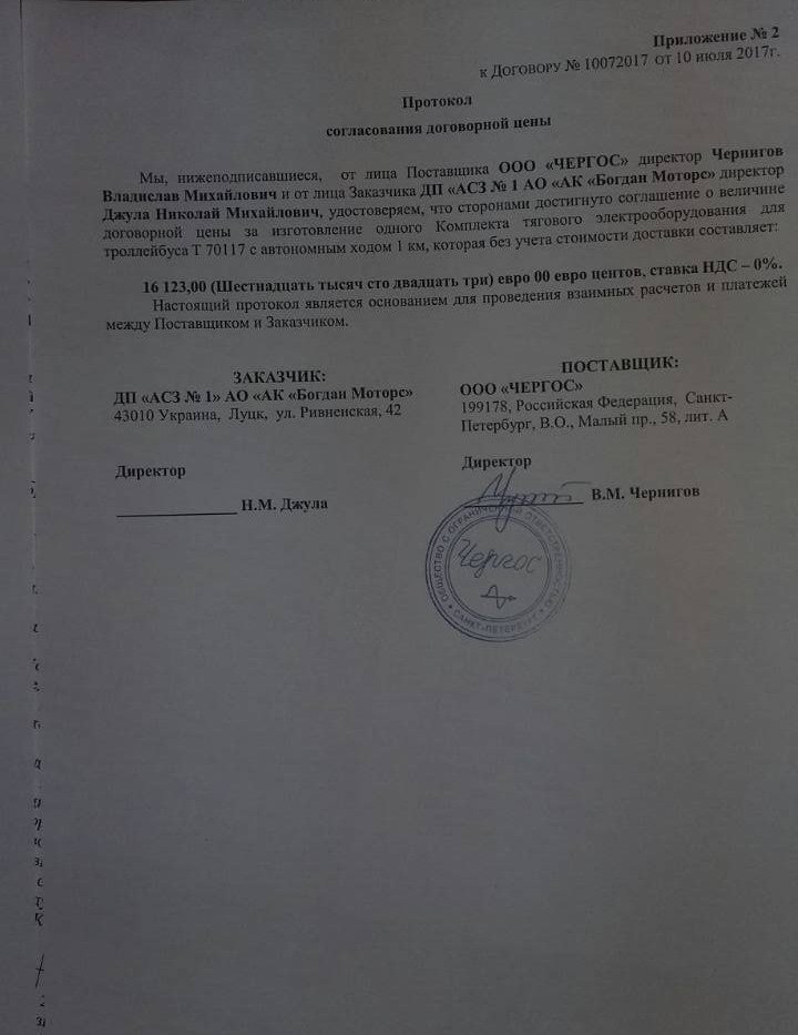 Окрім того, згідно з протоколом про узгодження ціни від 10 липня 2017 року, ТзОВ «ЧЕРГОС» та ДП «АСЗ № 1» АТ «АК «Богдан Моторс» дійшли згоди щодо договірної ціни на виготовлення одного комплекту тягового електрообладнання для тролейбуса Т70117 в сумі 16,123 тисячі євро.Нагадаємо, раніше також з’являлися повідомлення про те, що луцький автоскладальний завод закупляв електрообладнання та тяговий навіс фірми «ЧЕРГОС» для тролейбуса Т70117.