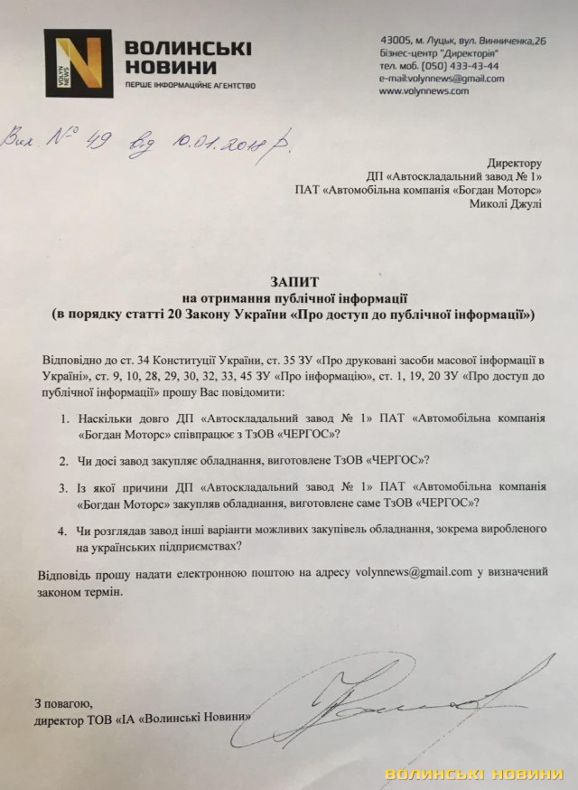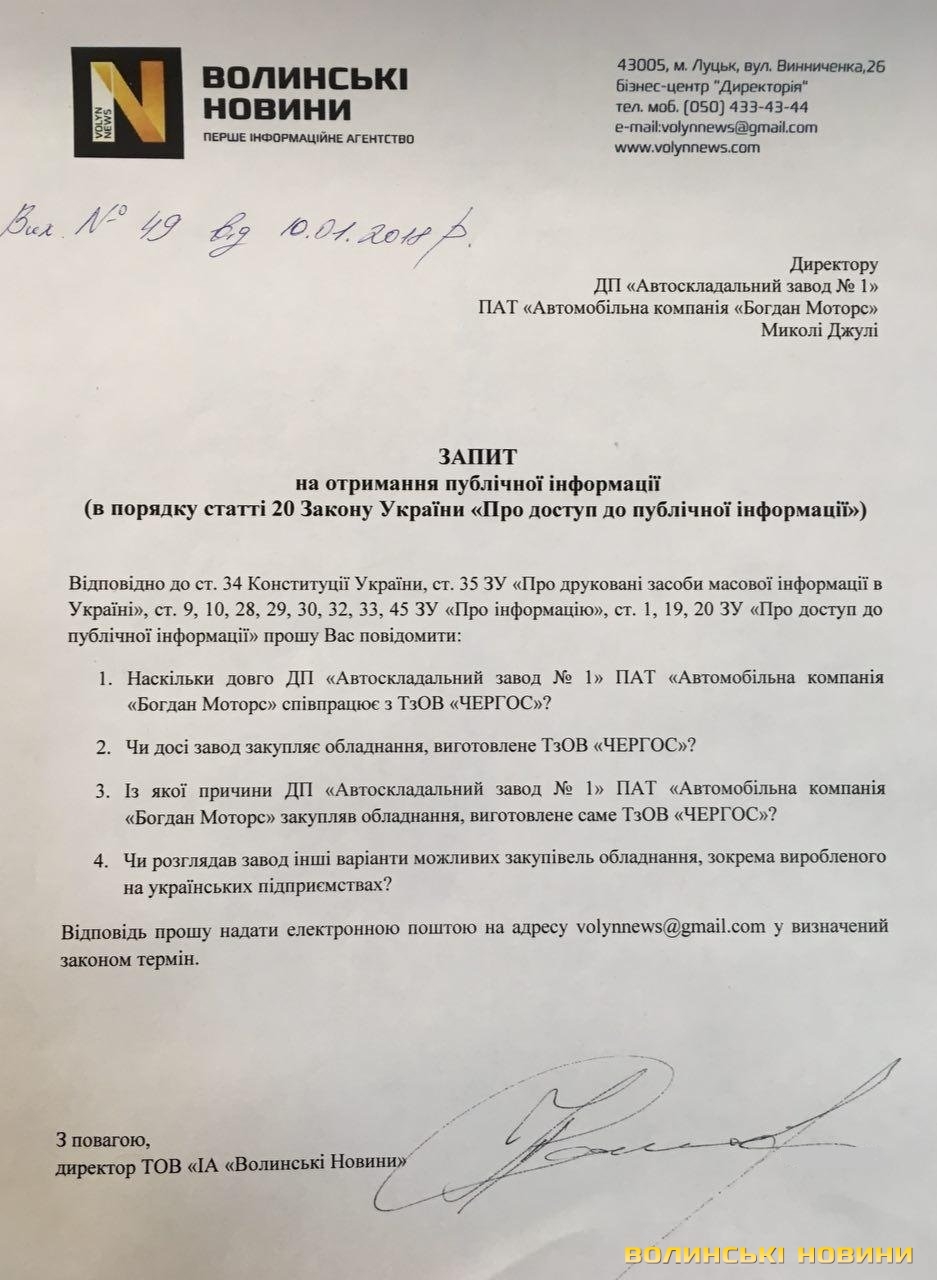 Відзначимо, що ТзОВ «ЧЕРГОС» було створено в 1991 році. Продукцію фірми найактивніше купують у Росії та країнах колишнього СНД. Також, окрім луцького автозаводу, на офіційному сайті ТзОВ «ЧЕРГОС» серед партнерів фірми згадано й два інші підприємства, розташовані в Україні. Це львівський «Електронтранс» та «Крюківський вагонобудівний завод» із Кременчука.Інформаційне агентство Волинські Новини, своєю чергою, звернулося до директора ДП «АСЗ № 1» АТ «АК «Богдан Моторс» з проханням прокоментувати ситуацію, проте на конкретно сформульовані запитання так і не отримало чітких відповідей. Фактично представники підприємства надіслали у відповідь на інформаційний запит відписку, де зазначено, наприклад, що ДП «Автоскладальний завод № 1» АТ «АК «Богдан Моторс» – це найбільше підприємство в Україні з виробництва сучасних автобусів і тролейбусів, з виробничою потужністю до 6000 автобусів і тролейбусів на рік».