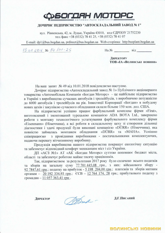Окрім того, у відповіді перераховано роботи, які здійснює завод за участі закордонних підприємств, та вказано загальну суму сплачених податків у 2017 році (77,701 мільйона гривень).