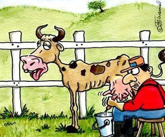 Подивилася на малюнок і підсвідомо порівняла цю сухоребру корівку з нашою державою, а ситого дояра, який витискає останню краплю молока – з владою.