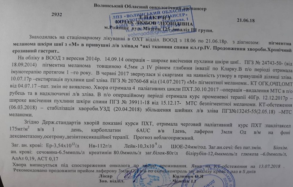 Здавалося, все минулося. Але підступна хвороба не відступила, навпаки, прогресувала. З липня 2017 року Любов Козак перенесла дев'ять «хімій».