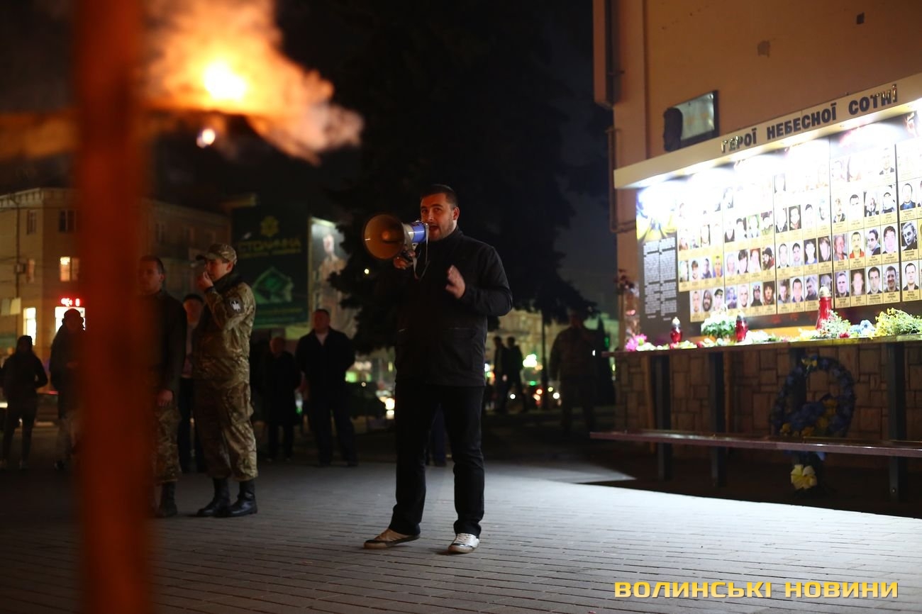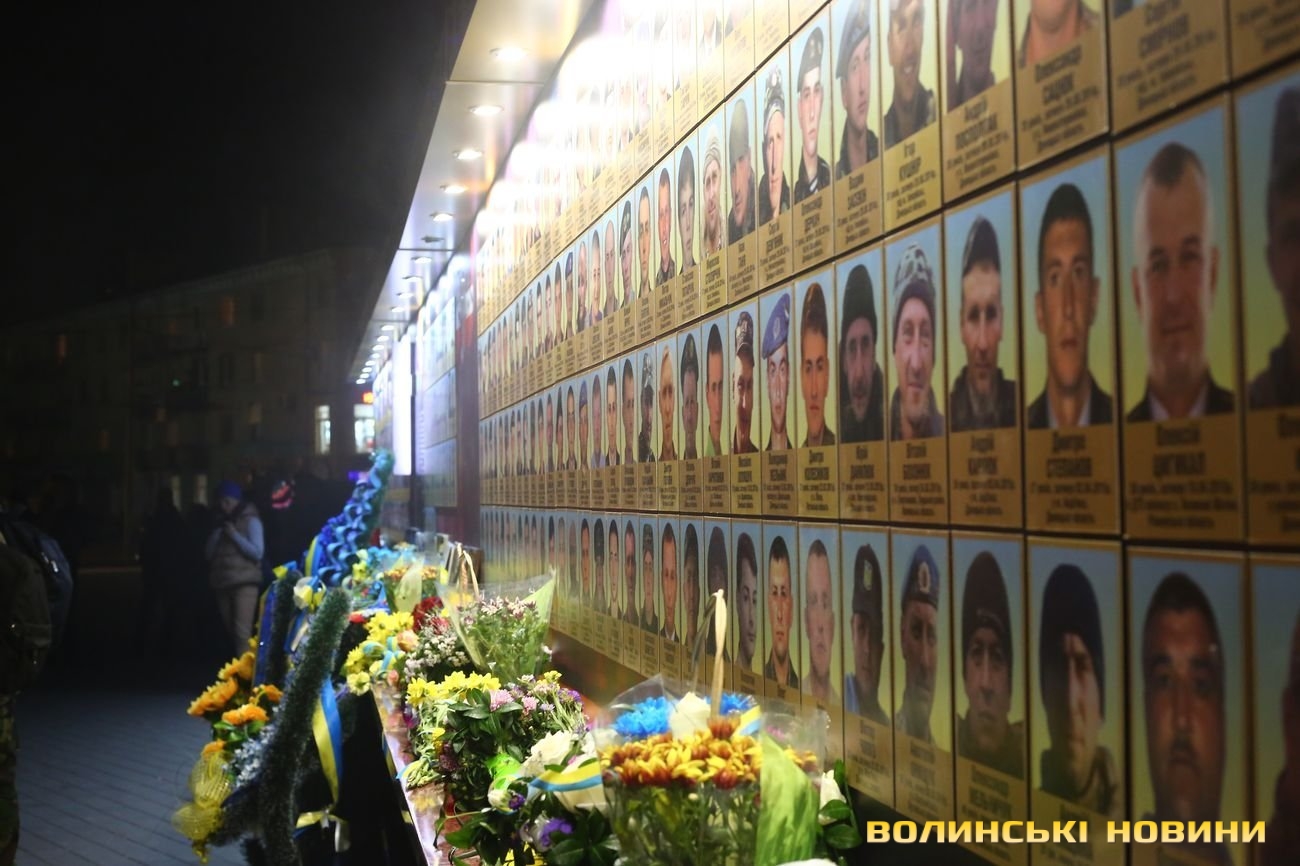 Марш зробив зупинку біля оновленого фотостенду пам’яті Героїв Небесної сотні та загиблих в АТО волинян. Там депутат Луцької міської ради та «нацальянсівець» Павло Данильчук звернувся до присутніх з подякую за те, що вони зібрались на таку акцію. Також зауважив, що цьогорічний марш є не таким багаточисельним, адже чимало волинян вирушили на аналогічні дійства до Києва.