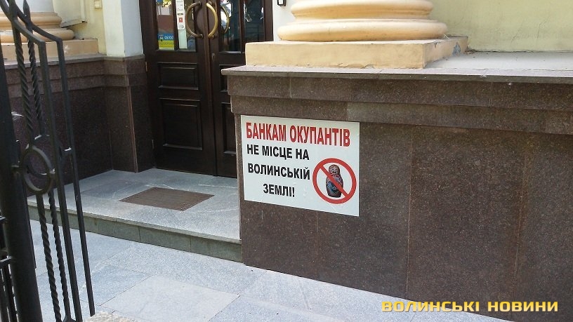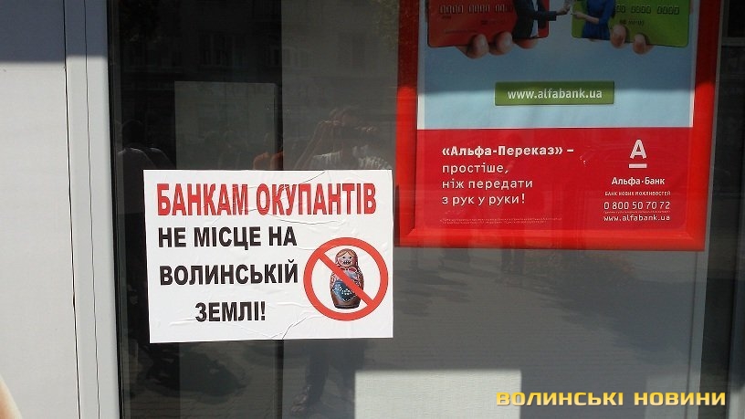 Активісти різних громадських організацій Волині, зокрема ГО «Бойкот» та ГО «Автомайдан Волині» вирішили повторити досвід своїх львівських колег та завітали до трьох найбільших російських банків у місті – «Сбербанку Росії», «Альфа-Банку» та «ВТБ». Вони передали керівникам установ звернення від імені своїх організацій з вимогою закрити власні філії. На це керівництву дали два тижні. В іншому випадку вони будуть всіма законними методами перешкоджати їхній діяльності. До слова, вчора у Львові відбулася аналогічна акція.
