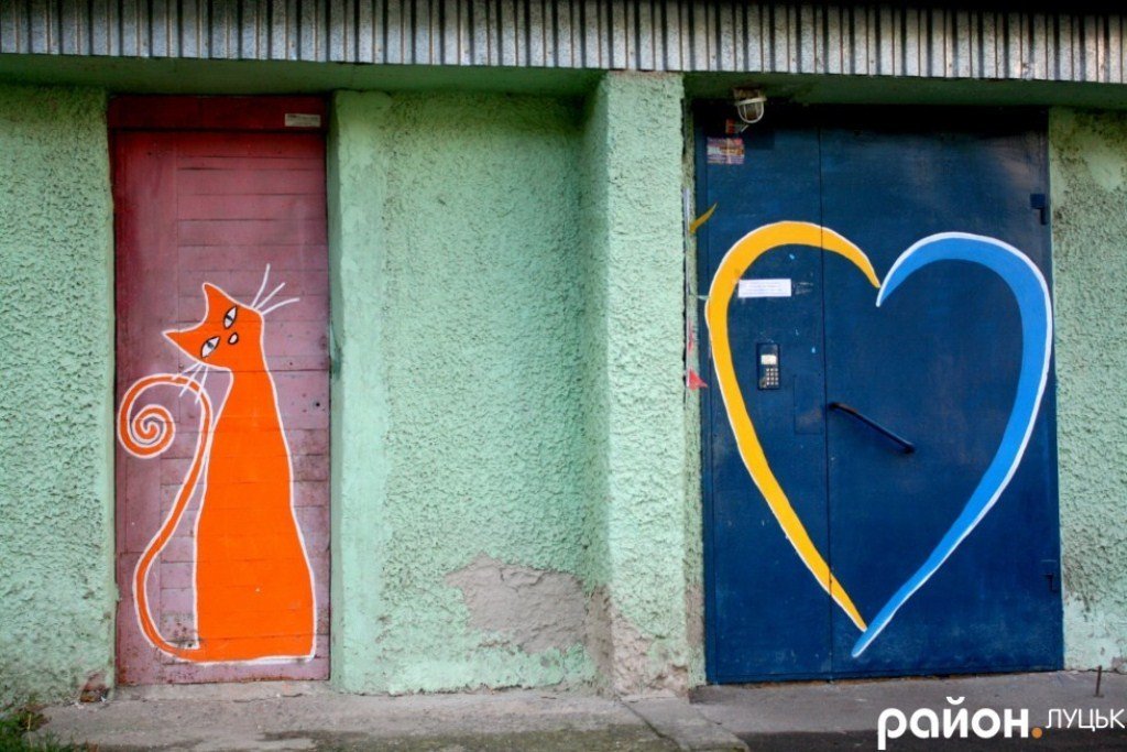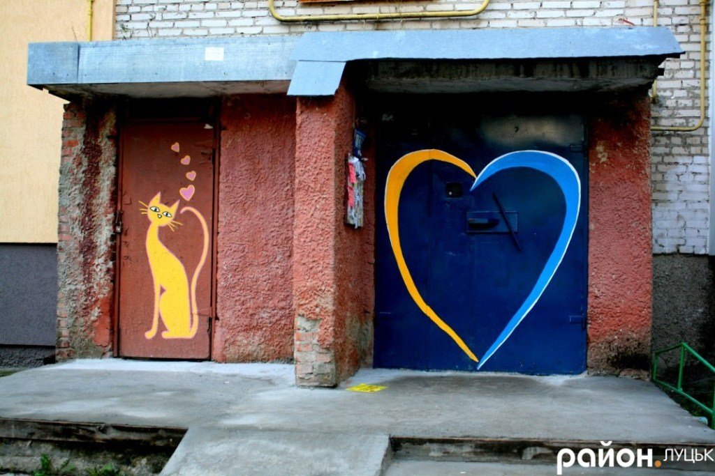 Витвори мистецтва можна побачити не лише у музеях чи в картинних галереях. Долучитися до прекрасного можна навіть тоді, коли заходиш у двері власного під’їзду. Таку можливість мають жителі вулиці Дружби народів 8, 8а, 10, 12. Тут на дверях кожного під’їзду намальоване велике серце у жовто-блакитній гамі, а збоку примостилися різнокольорові котики, - повідомляє «Район.Луцьк».