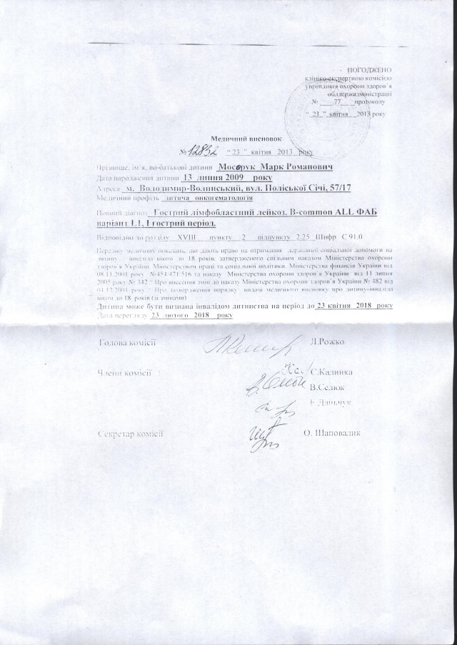 У Марка Мосорука страшний діагноз - гострий лімфобластний лейкоз. Батьки Ольга і Роман просять про допомогу, адже на лікування потрібні значні кошти, яких у сім’ї немає, адже лікують ще й Ольгу від цукрового діабету.