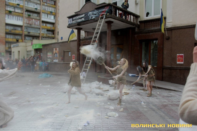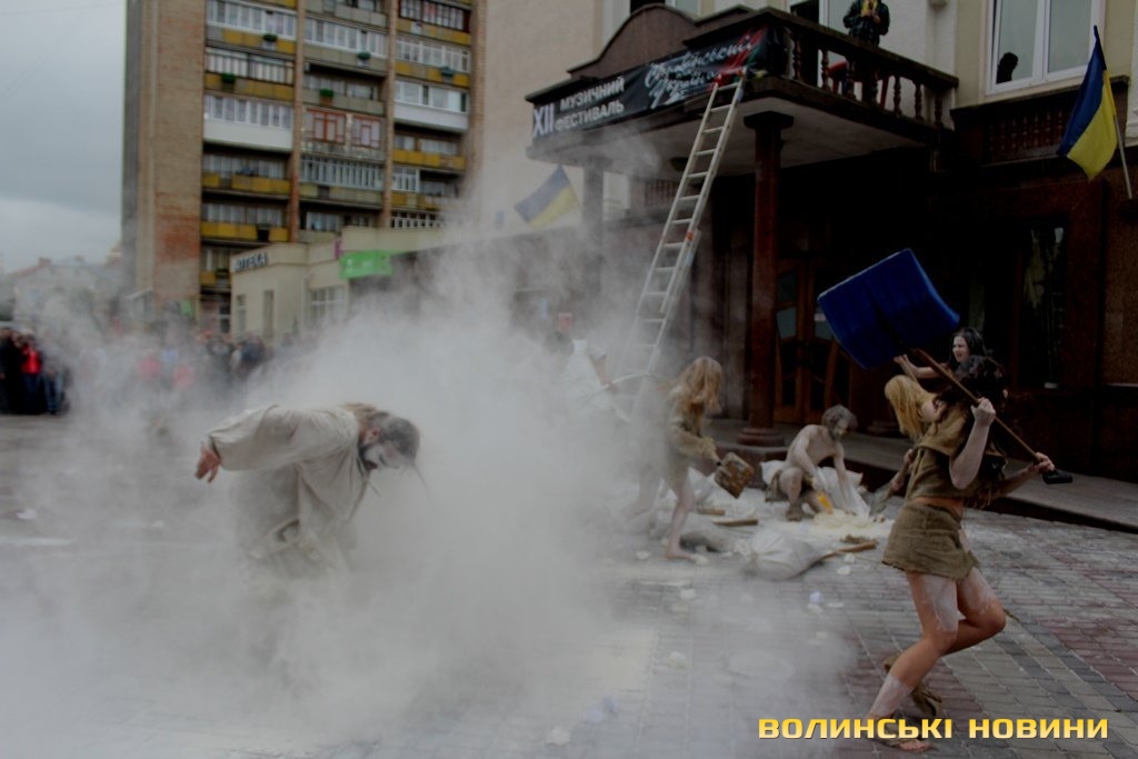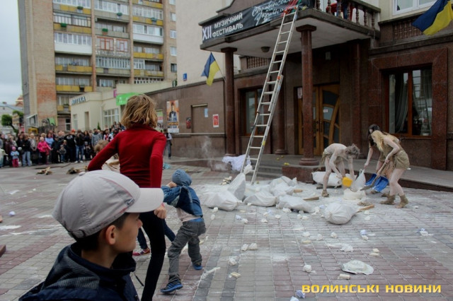 Допомагати Дон Кіхотові покликали глядачів, роздаючи їм пакунки з борошном. Особливо сподобався «бій» дітям. Тож бруківка перед Палацом культури була всіяна борошняною «пудрою».По закінченню постановки актори розповіли, що друга частина вистави називатиметься «прибирання». А після постановки глядачі щедро винагородили акторів, кидаючи гроші у валізу.