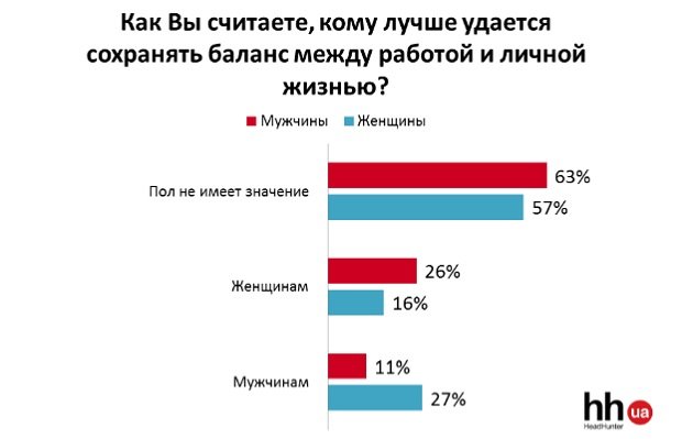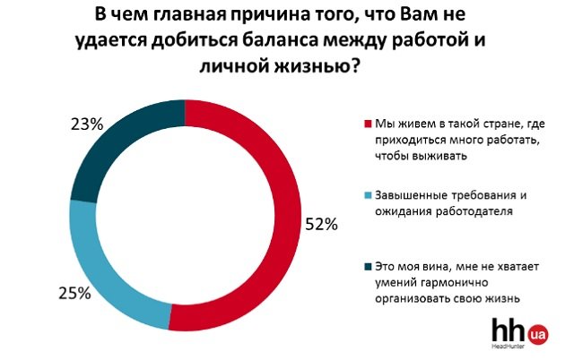 Кожен другий головною причиною того, що йому доводиться багато працювати і жертвувати собою заради кар'єри, назвав складну ситуацію в країні. Ще чверть пояснюють такий стан речей завищеними вимогами з боку роботодавця. І майже стільки ж бачать причину в самих собі і в своєму невмінні гармонійно організовувати своє життя.На думку більшості офісних співробітників, вміння зберігати баланс між роботою та особистим життям не залежить від гендерної приналежності. При цім, жінки більше схильні вважати, що це краще вдається чоловікам, а чоловіки, навпаки, частіше віддають першість в цьому навику представницям прекрасної половини людства.Згідно з даними опитування, дві третини роботодавців в Україні підтримують ідею про баланс роботи та особистого життя своїх підлеглих. Практично кожен другий з розумінням ставиться до необхідності співробітника іноді бути відсутнім в офісі з особистих причин.