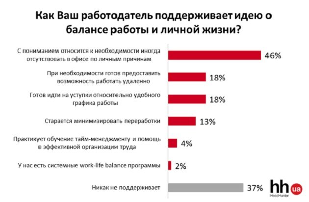 Один з восьми намагається мінімізувати перепрацювання. А ось навчання тайм-менеджменту проводять не більше ніж в 4% компаній. Ще рідше зустрічаються в українських офісах системні work-life balance програми.Дані були отримані в результаті опитування, проведеного Дослідницьким центром Міжнародного кадрового порталу hh.ua в січні 2017 року. В опитуванні взяли участь 800 респондентів з різних регіонів України.