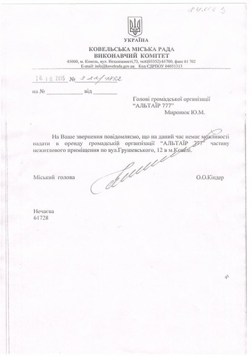 Ковельський мер Олег Кіндер відмовляє громадські організації «Альтаїр777» у наданні в оренду приміщення: