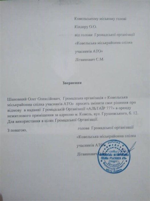 Бійці 44 окремої артилерійської бригади з Ковеля звернулися до мера міста Олега Кіндера, аби той не позбавляв приміщення волонтерів ГО «Альтаїр», оскільки раніше міський голова відмовив цій організації у наданні в оренду приміщення (документи нижче).