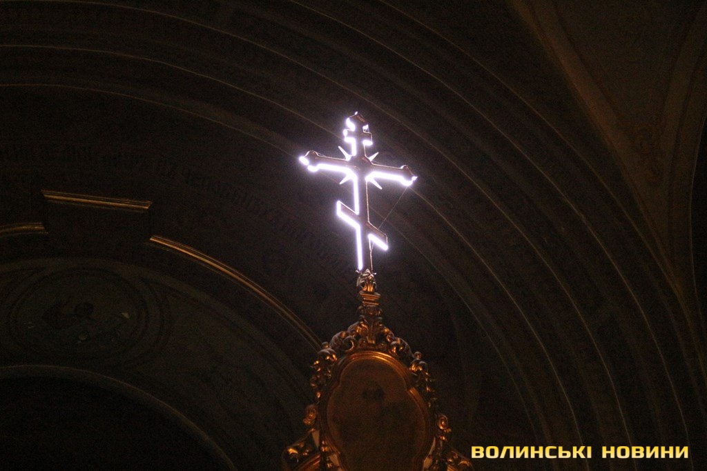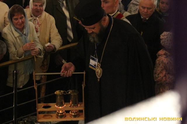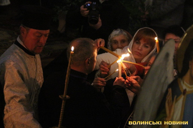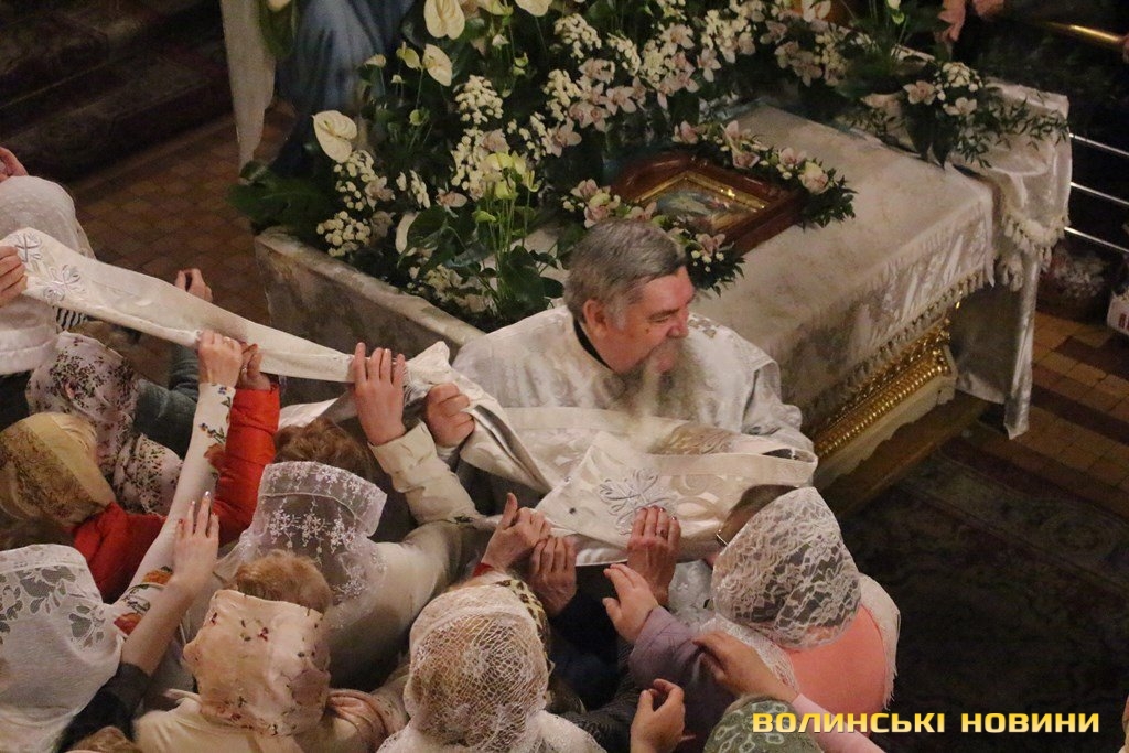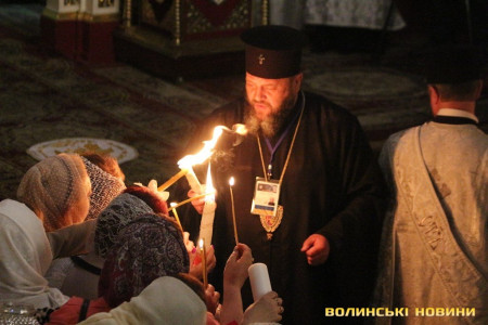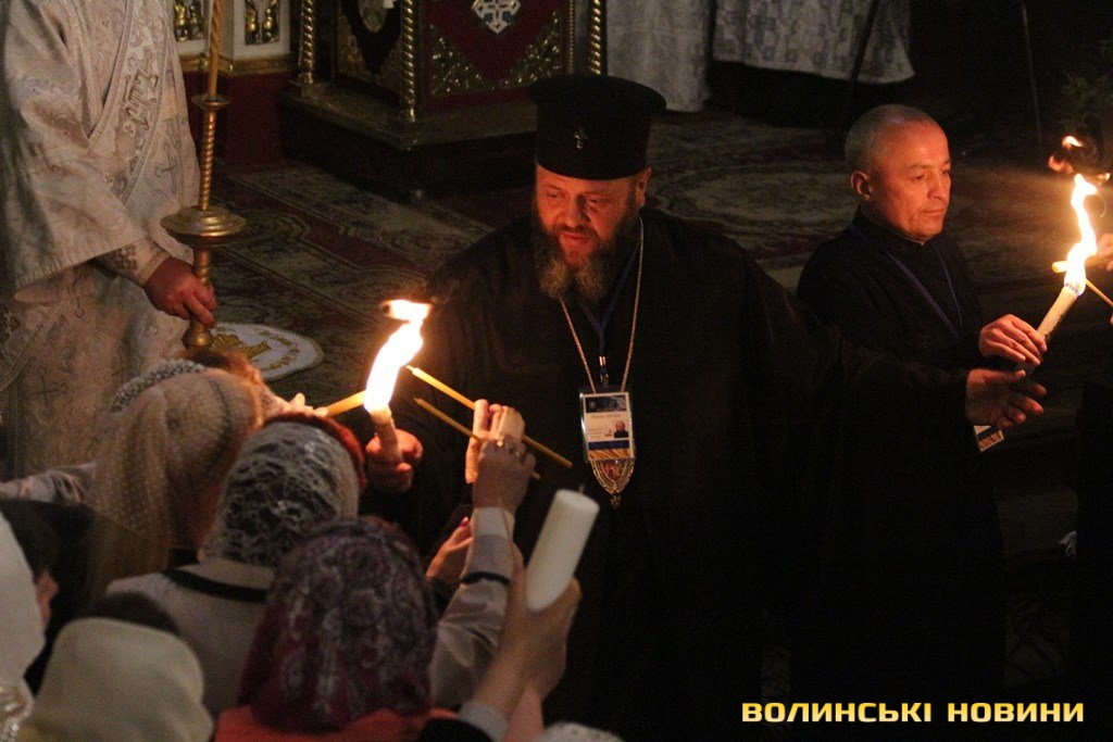 Близько першої години ночі, митрополит Михаїл привіз до обласного центру Волині єрусалимський вогонь, який опісля доставили до багатьох храмів Волині.Також владика запалив благодатним вогнем свічки та лампадки усім вірянам.Після цього розпочалась святкова літургія.«Наш Бог – не Бог мертвих, наш Бог – Бог живих. Він дає нам не скорботу за тими, кого вже немає з нами, а радість, що колись побачимось. А зараз пам’ятаємо, відчуваємо та усвідомлюємо, що вони поруч з нами: вони нас чують, за нас моляться, до нас приходять, ми з ними спілкуємось на цвинтарі, через фотографії, через молитви. Але віримо у це, бо віримо у Воскресіння Христове. Ми оспівуємо Христа не лише як Чудотворця, а як Того, Хто смертю смерть подолав і тим, хто в гробах, життя дарував. Він – Господар життя, який, першим зійшовши до пекла, воскресив мертвих. Я бажаю, щоб ви, споглядаючи на воскреслого Христа, пам’ятали не лише за Паску, а щоб раділи із середини. Усвідомте, що ви тепер не самі, а поруч з вами сьогодні ваші батьки та близькі, яких уже з нами немає. І це радість спілкування і спільного буття. Бо Христос подолав смерть. Ми розуміємо, що таке смерть і бачимо бездиханне тіло. Але воскреснуть всі! Ті, хто від нас відійшов – живі. Бо не говорять про них як про померлих, а як про уснувших. Пригадаймо, як співаємо: «У блаженнім успінні вічний спокій». Тобто вони не щезають. Тому радійте тій радості, яка окриляє нас через сходження благодатного вогню, через слухання священного писання. Хай ця радість всеосяжна якомога довше перебуває у серці нашому, особливо у дні Світлого Христового Воскресіння. Христос Воскрес!» - звернувся до присутніх владика Михаїл.