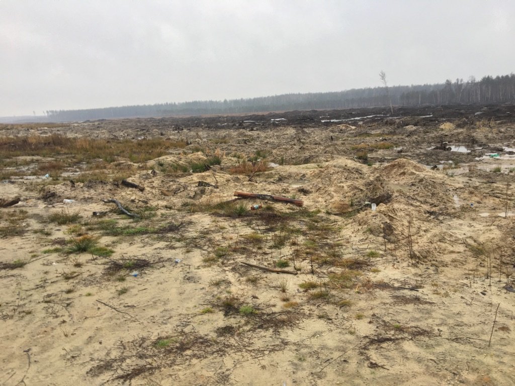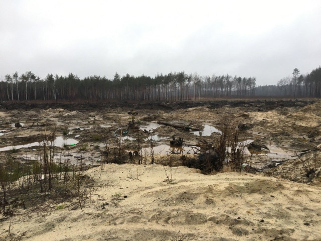 Так виглядають вже відпрацьовані місця в Олевському районі, де старателі вже все перекопали. Випалена пустеля, на якій ліс знову виросте в кращому випадку через десятки років. Ці старі «клондайки» просто кидають, і ніхто не проводить на них ніякої рекультивації. Чи не відновлюється родючий шар, не проводиться висадка дерев.