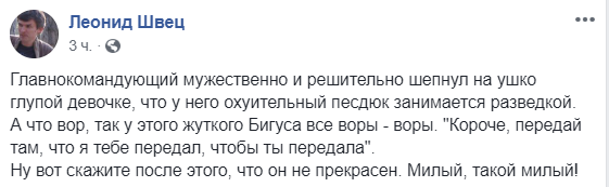 «Головнокомандувач мужньо і рішуче прошепотів на вушко дурній дівчинці, що у нього ох... вальний п..к займається розвідкою. А що злодій, так у цього моторошного Бігуса всі злодії – злодії.» Коротше, передай там, що я тобі передав, щоб ти передала". Ну от скажіть після цього, що він не прекрасний. Милий, такий милий!».
