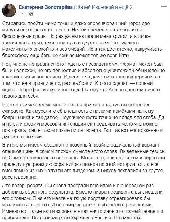 «Мені не сподобався цей «день з президентом». Формат може був би і непоганий, але його повністю і абсолютно знищили звичайним нехорошим виконанням. І справа не в діях головної героїні, а в тому, що її в принципі під це вибрали. Хто це зробив – повний ідіот. Непрофесіонал. Тому що Аня не зробила нічого нового для себе.