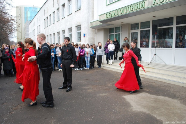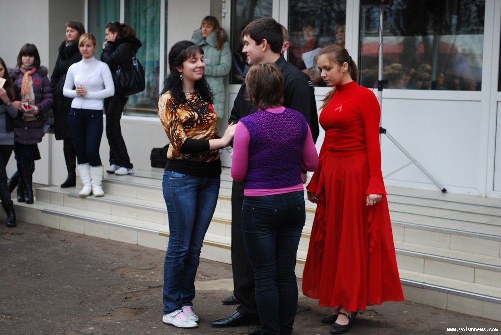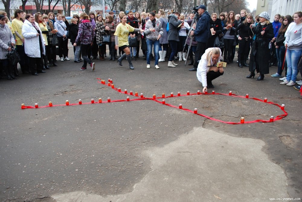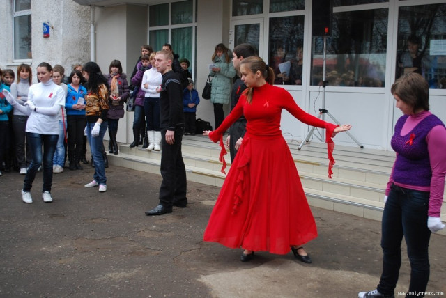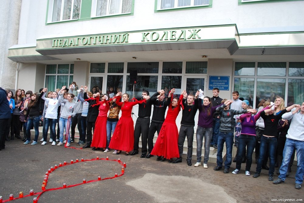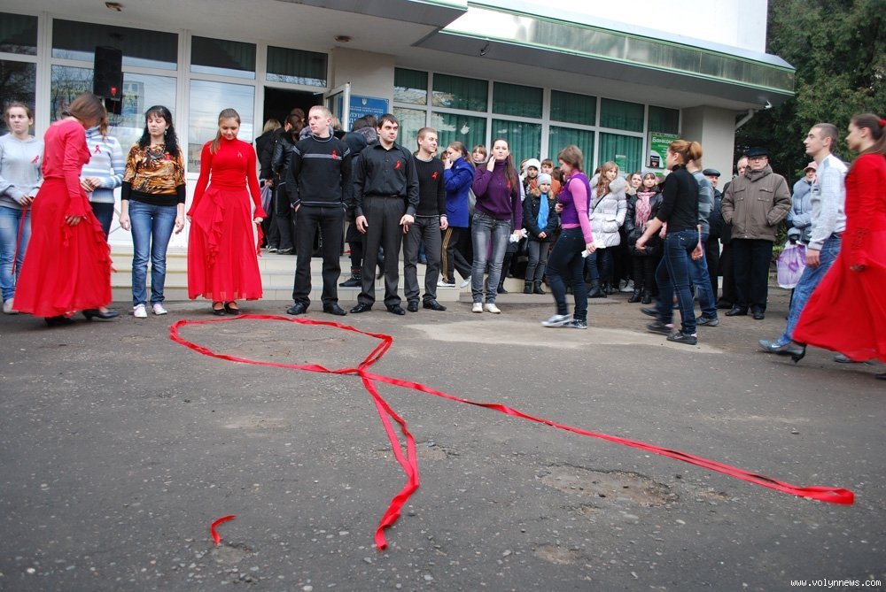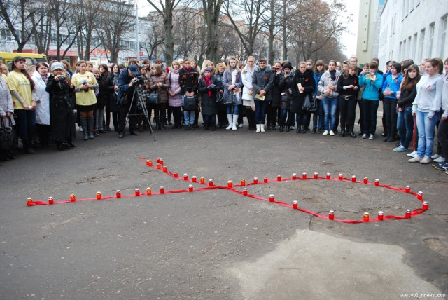 Насамкінець студенти виклали червону стрічку з лампадок, яка символізує солідарність з ВІЛ-позитивними та хворими на СНІД.