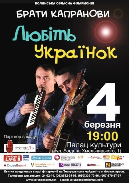 Відомі письменники Брати Капранови на початку березня приїдуть на Волинь з музичною програмою «Любіть українок», присвяченою українським жінкам. Організовує захід мистецьке об’єднання «стендаЛь» за підтримки Волинської обласної філармонії.