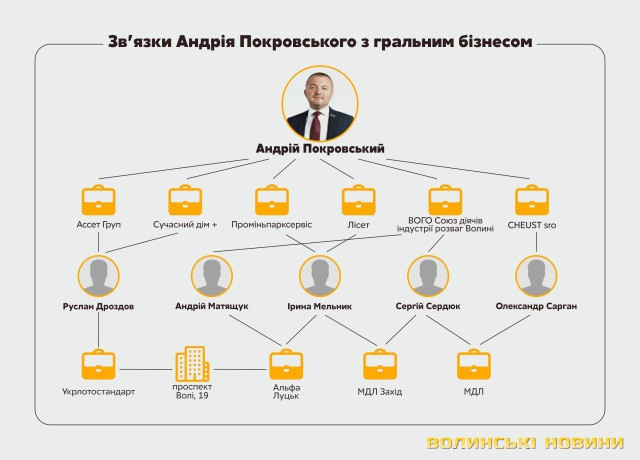 Він зауважив, що засновник компанії МДЛ, яка займається гральним бізнесом на Волині, громадянин Словацької Республіки Сарган Олександр Ілліч є бізнес-партнером Андрія Покровського.Окрім того, керівник ТОВ МДЛ Сердюк Сергій Адамович є водночас керівником Союзу діячів індустрії розваг Волині, а засновник цієї громадської організації - Андрій Покровський.