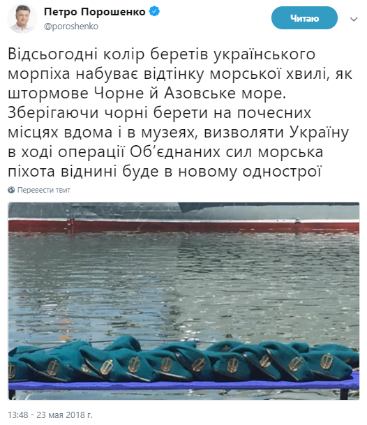 «Виходячи з нашого власного історичного календаря, прийняв рішення встановити новий День морської піхоти України, який відтепер буде відзначатися на державному рівні 23 травня. Підписав відповідний указ», - повідомив Порошенко.