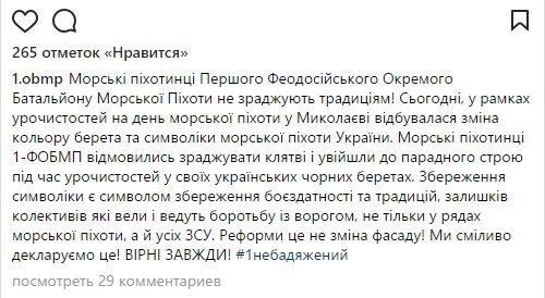 «Морські піхотинці 1-ФОБМП відмовилися зраджувати клятву і вийшли в парадному строї під час урочистостей у своїх українських чорних беретах. Збереження символіки є символом збереження боєздатності і традицій, залишків колективів, які вели і ведуть боротьбу з ворогом, не тільки в рядах морської піхоти, але і всіх ЗСУ», - йдеться в повідомленні.