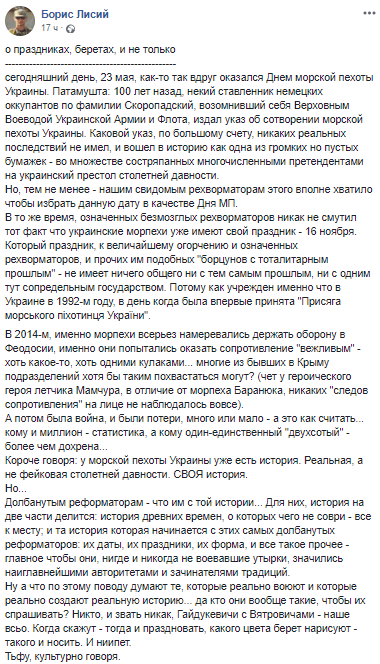 «23 травня раптом виявилося Днем морської піхоти України. Тому що: 100 років тому, якийсь ставленик німецьких окупантів на прізвище Скоропадський, уявивший себе Верховним Воєводою Української Армії і Флоту, видав указ про створення морської піхоти України. Указ, який за великим рахунком, ніяких реальних наслідків не мав і увійшов в історію як один із гучних, але порожніх папірців - зліплений численними претендентами на український престол столітньої давності.