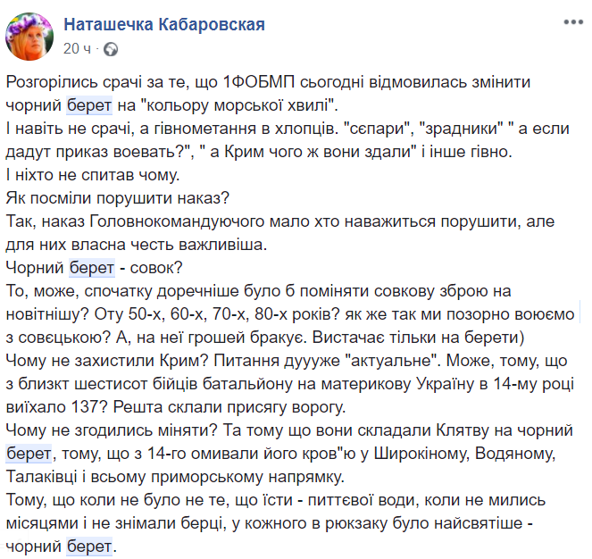 Люди, що мають відношення до армії, почали обговорювати в соцмережах скандал з черговою заміною беретів і історичних змістів. Обурений пост на цю тему написав феодосійський піхотинець і ветеран АТО Борис Лисий: