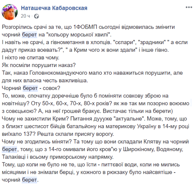 «Чорний берет - совок? Може, спочатку доречніше було б поміняти совкову зброю на щось новіше? Те, що 50-х, 60-х, 70-х, 80-х років? Як же так ми ганебно воюємо з радянським? А на нове грошей не вистачає. Вистачає тільки на берети», - пише користувач Наталя Кабаровська.