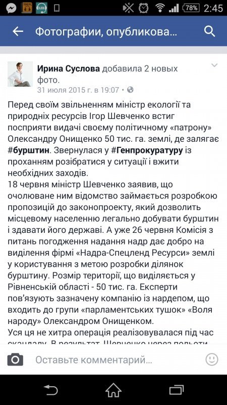 У липні минулого року депутат Ірина Суслова заявила, що перед самим звільненням міністр екології та природних ресурсів Ігор Шевченко встиг “посприяти своєму політичному патрону Олександру Онищенку у видачі 50 тисяч гектарів землі, де залягає бурштин.